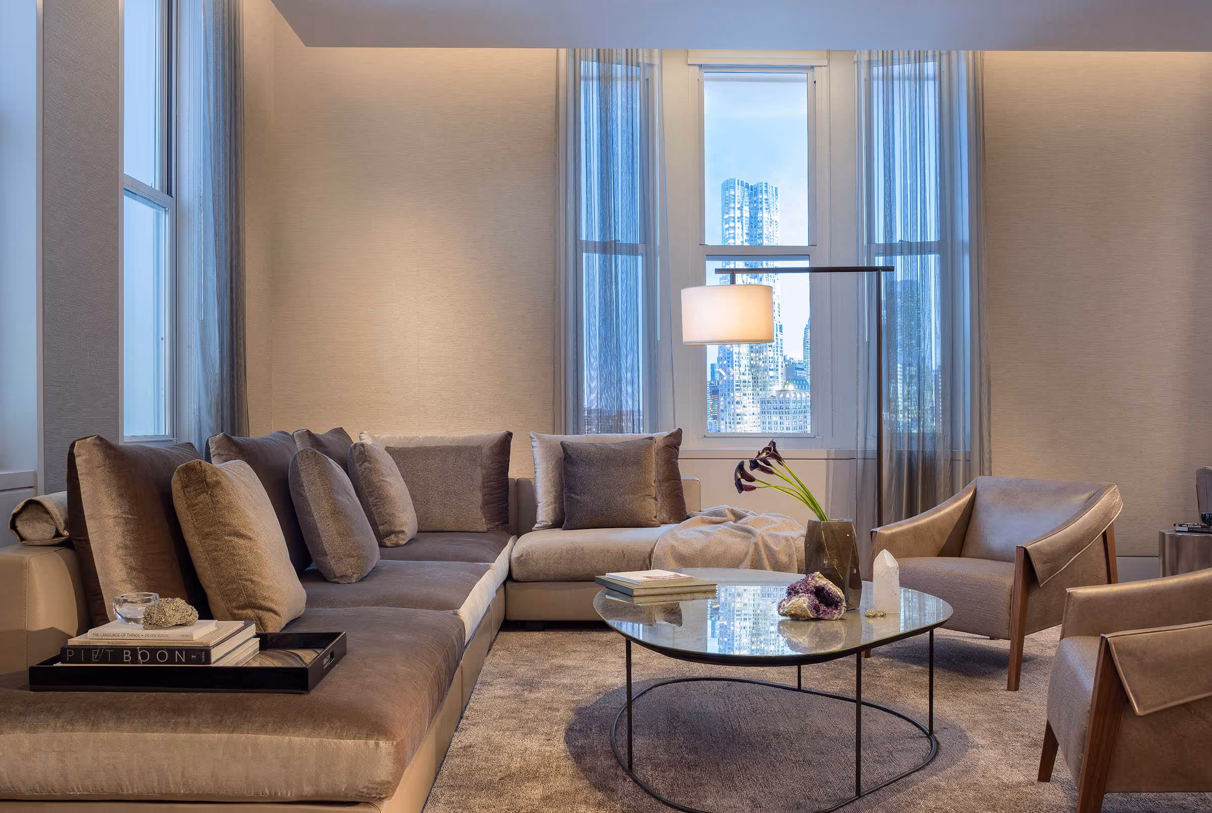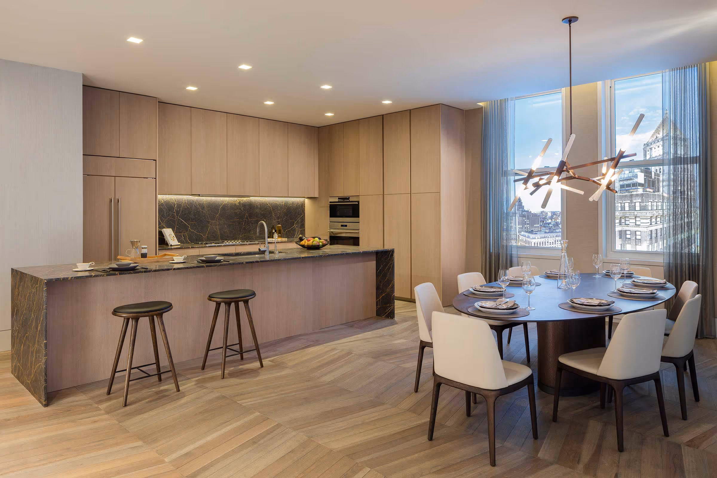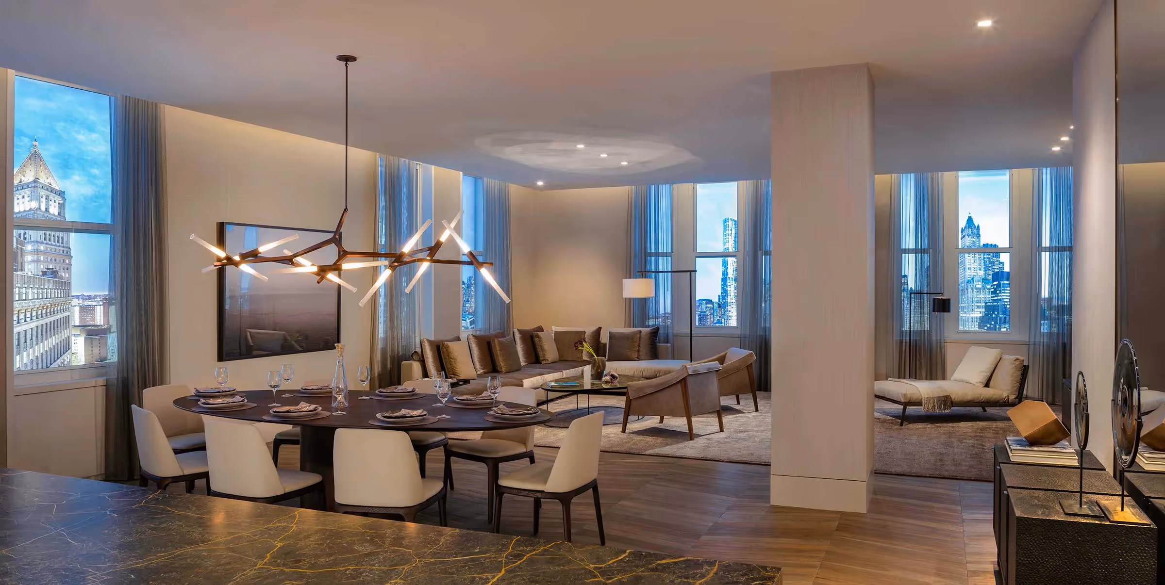 The building offers residents exclusive amenity spaces at the base and top, creating private sanctuaries for health and rejuvenation. These thoughtfully designed areas cater to fitness, play, entertainment, and relaxation. The swimming pool area features a vaulted ceiling inspired by the building's historic Banker's Hall, while other highlights include a modern hamam, cardio exercise room, yoga studio, virtual golf room, game room, and multiple entertainment and business lounges. The rooftop level boasts an indoor-outdoor garden with convertible dining areas, offering stunning views of City Hall Park and the Woolworth Building. Restored carved limestone architectural details coexist harmoniously with minimalist and natural elements, such as glass parapets and lush evergreen walls adorned with flowering vines, trees, and shrubs.
