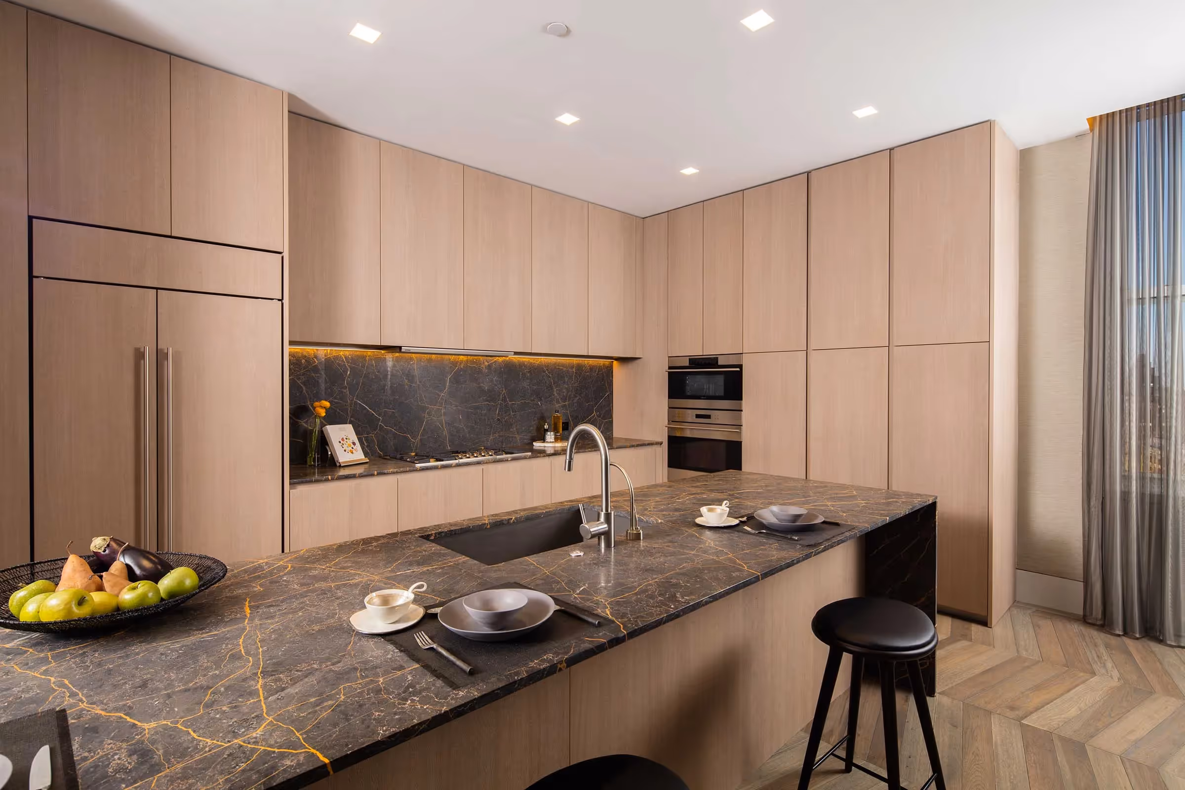 The residential units boast generously proportioned living spaces with meticulous attention to detail. Museum-quality stone baseboard reveals, integrated recessed lighting, Italian closet systems, quarter-sawn cypress woodwork, and acoustical ceilings ensure privacy and luxury. The custom herringbone pattern of the hardwood flooring and the waterfall edge of the stone kitchen counters showcase exceptional craftsmanship. The master bathrooms, reminiscent of Roman baths, feature honed Ariel White marble, custom-designed double vanities, Apaiser stone tubs, and radiant floor heating. Even the residential corridors receive special treatment with unique ceilings and lighting to mark the entrance of each residence.