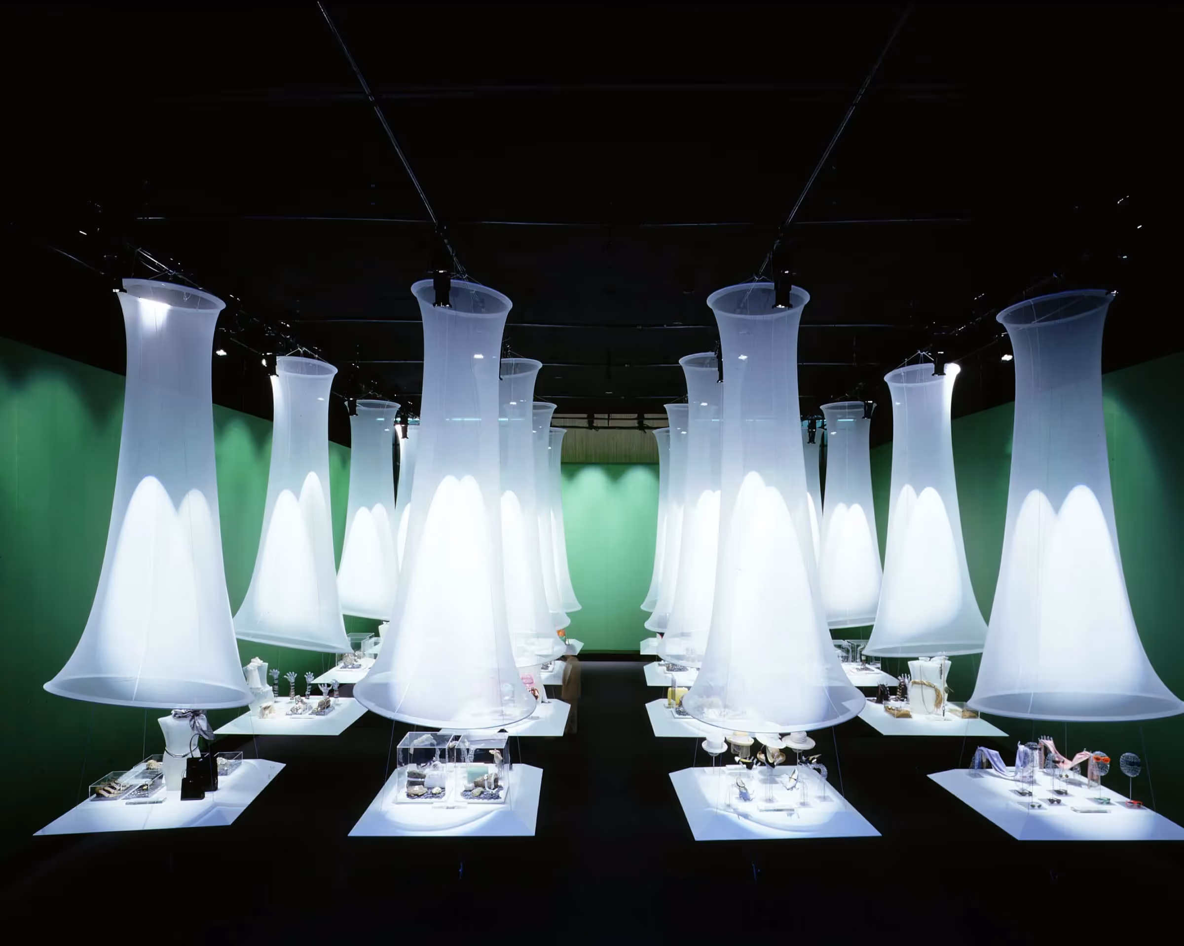 The accessory designer exhibitions were conceived by Gabellini Sheppard Associates as 'black box theatre' environments. The spring/summer exhibition featured three large perimeter walls painted in iridescent green. Floating white beveled platforms showcased accessories from twenty-eight designers. Sixteen suspended light canopies, resembling carousels, were linked to these structures. Above the display surface, theatrical light fixtures hung in a random celestial arrangement, piercing the canopies with alternating daylight and moonlight hues. This created a sensation of being within a clover field, immersed in changing natural light.