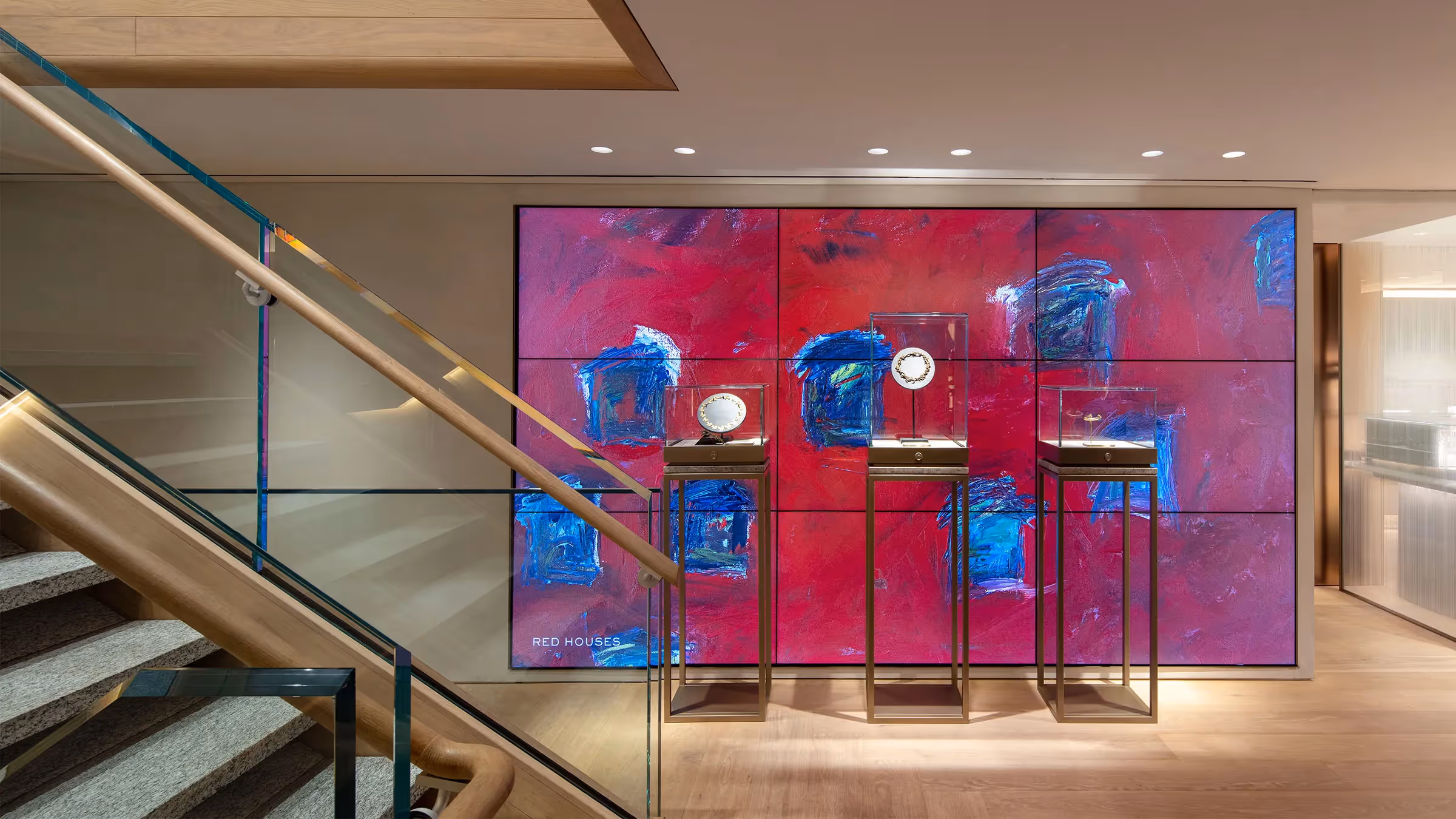 The attention to detail extends to the floors and ceilings, with a custom geometric pattern of marble and limestone on the main floor, complemented by thick Dinesen oak planks on the upper levels. The oak ceiling features a concentric design of overlapping planks, adding texture and creating a sense of familiarity with the brand's heritage while embracing a new direction. The grand staircase serves as a highlight, featuring unique treatments of wood, stone, and glass. Textured Serizzio Formazza granite slabs, sculpted French oak, and crystal glass guardrails ascend in tactile and textured sophistication, creating a captivating axis within the store.