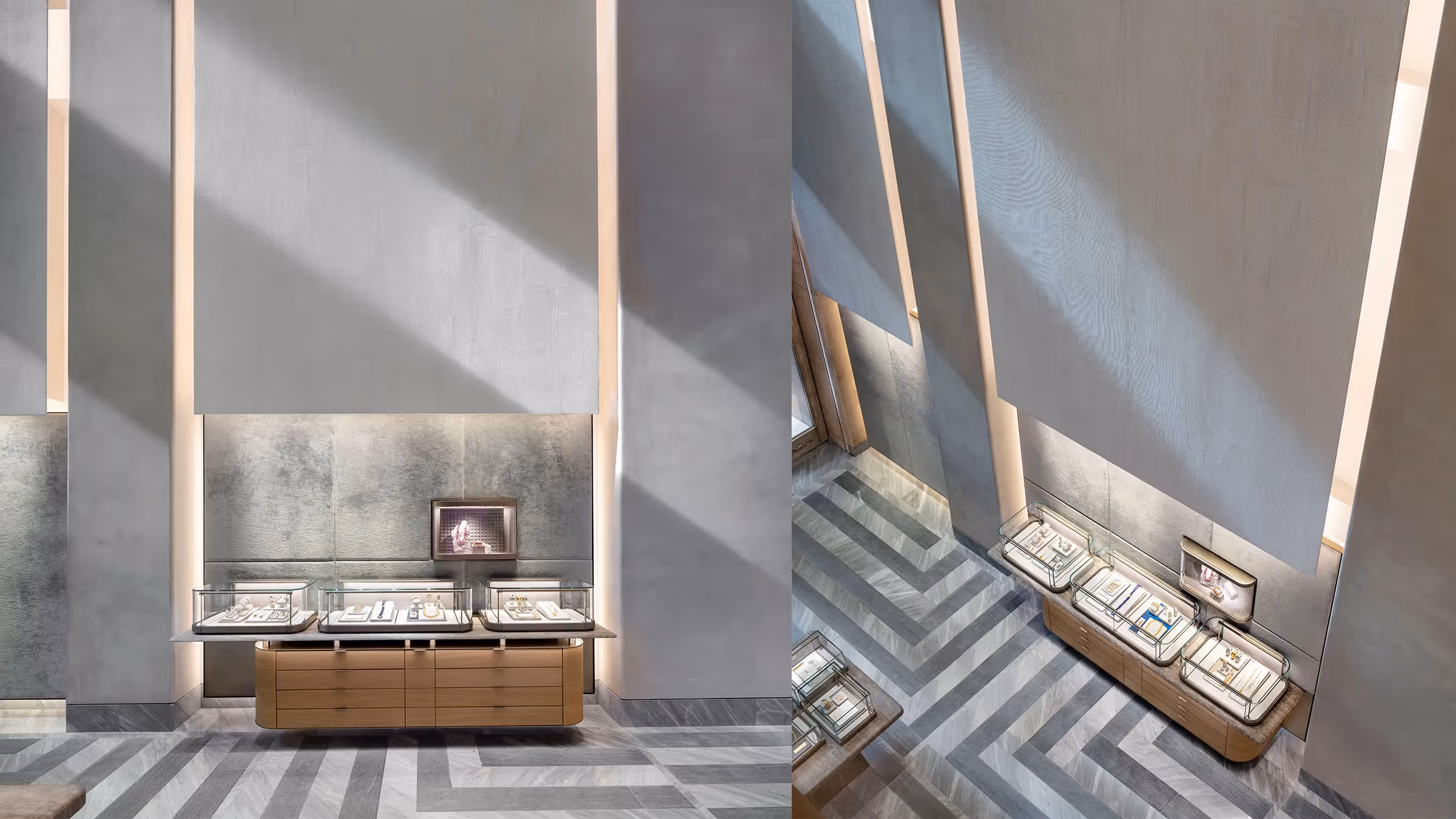 Upon entering the store from 57th Street, visitors are greeted by a soaring façade adorned with limestone, fluted granite, and a monolithic rose gold cross piece. This grand entrance sets the stage for a retail experience that unfolds like a performance. Inside, the interior design strikes a balance between warmth and subtle Brutalist elements, combining masculine and feminine energies through carefully selected forms and materials. Silver nickel and rose gold finishes enhance the display of exquisite jewelry, while marble and granite contribute to the luxurious texture and finish palette.
