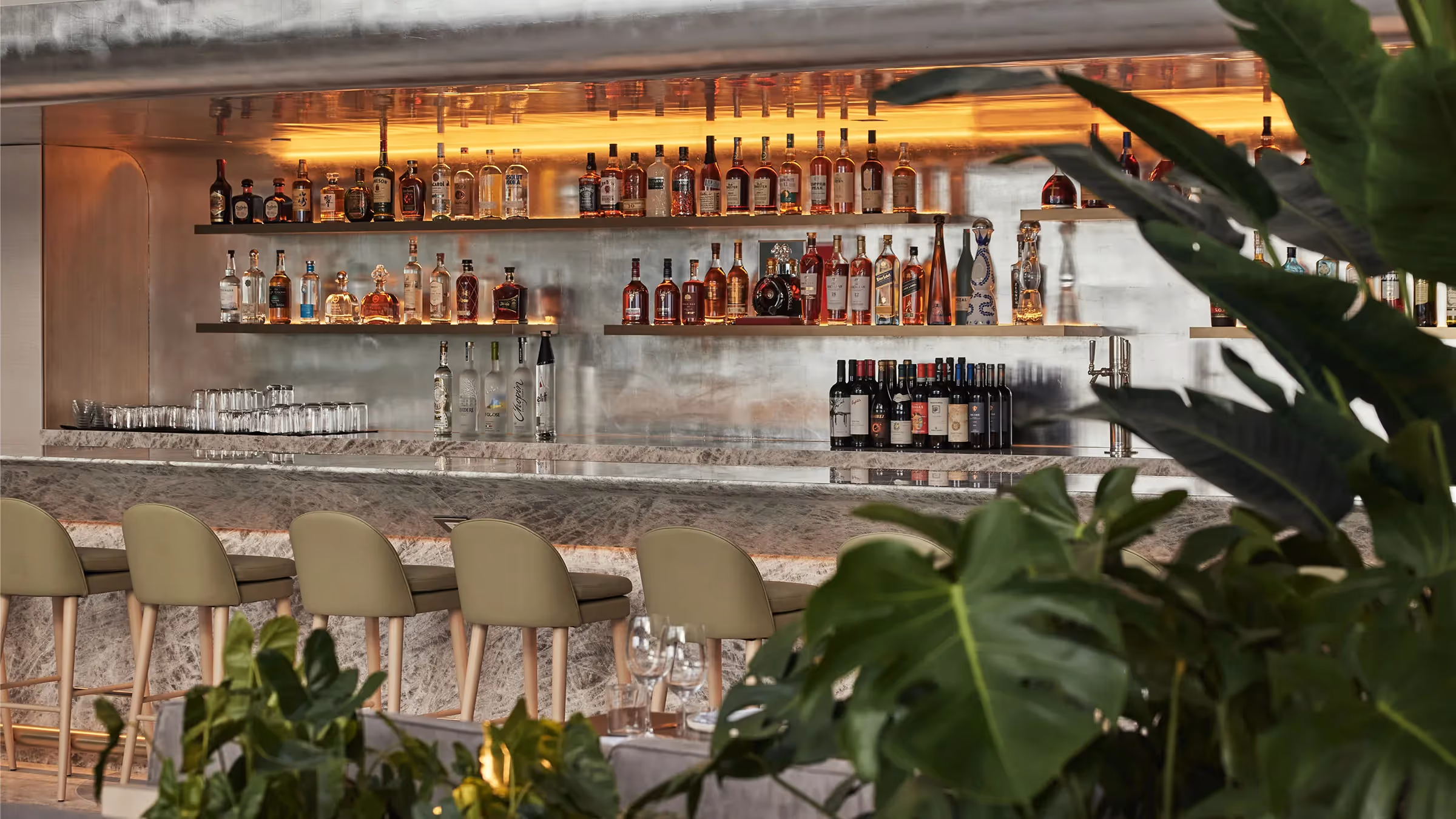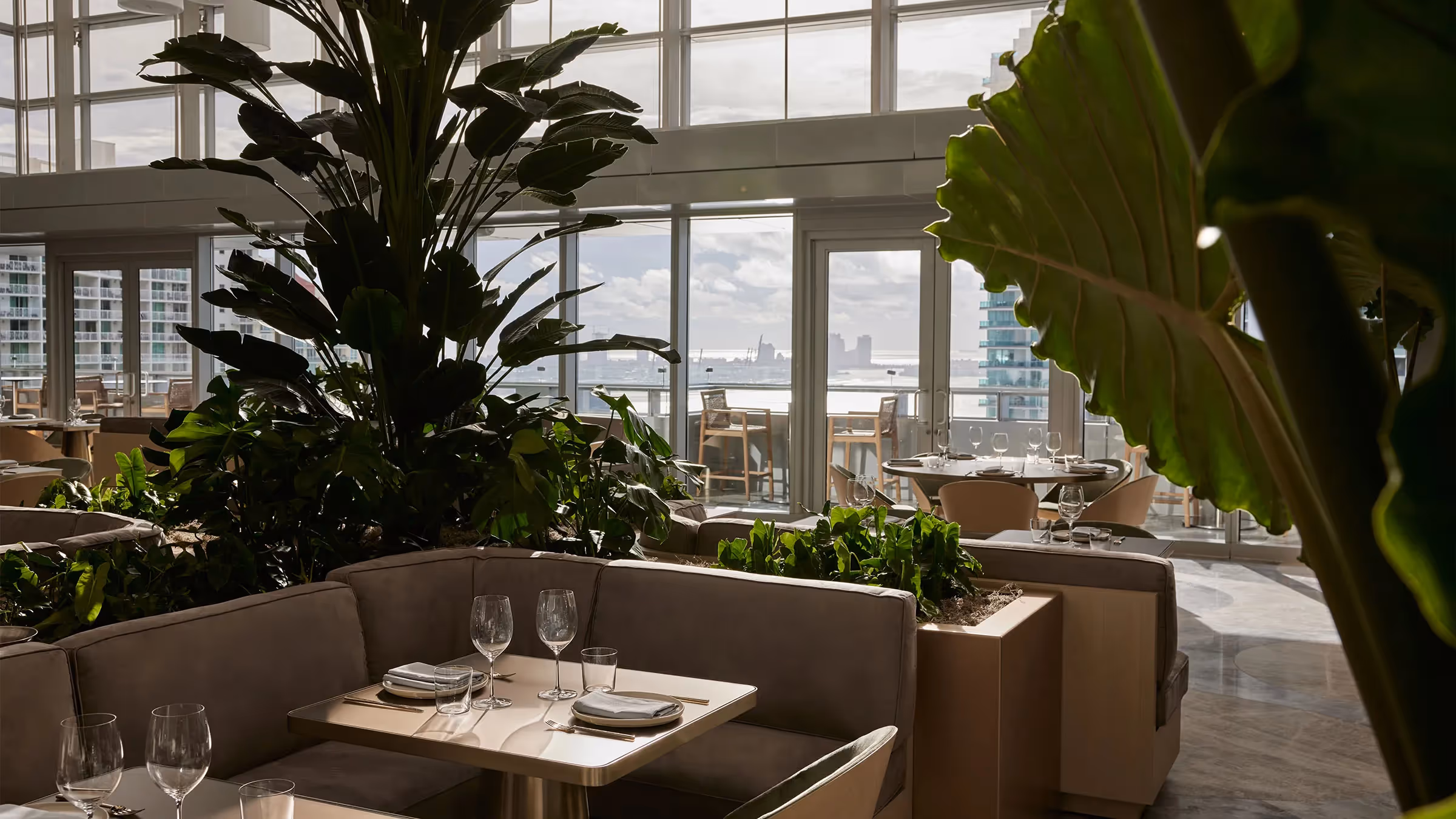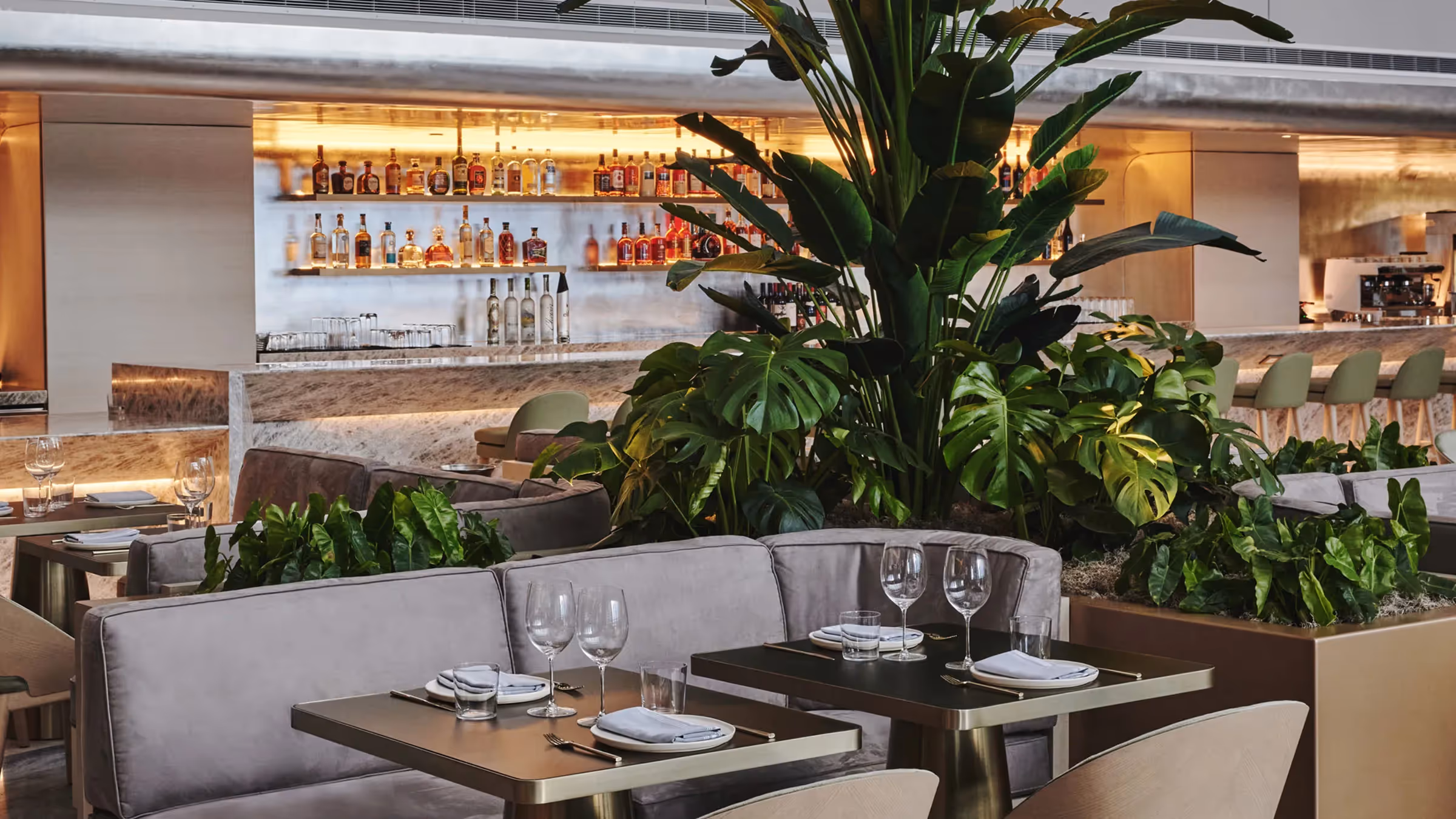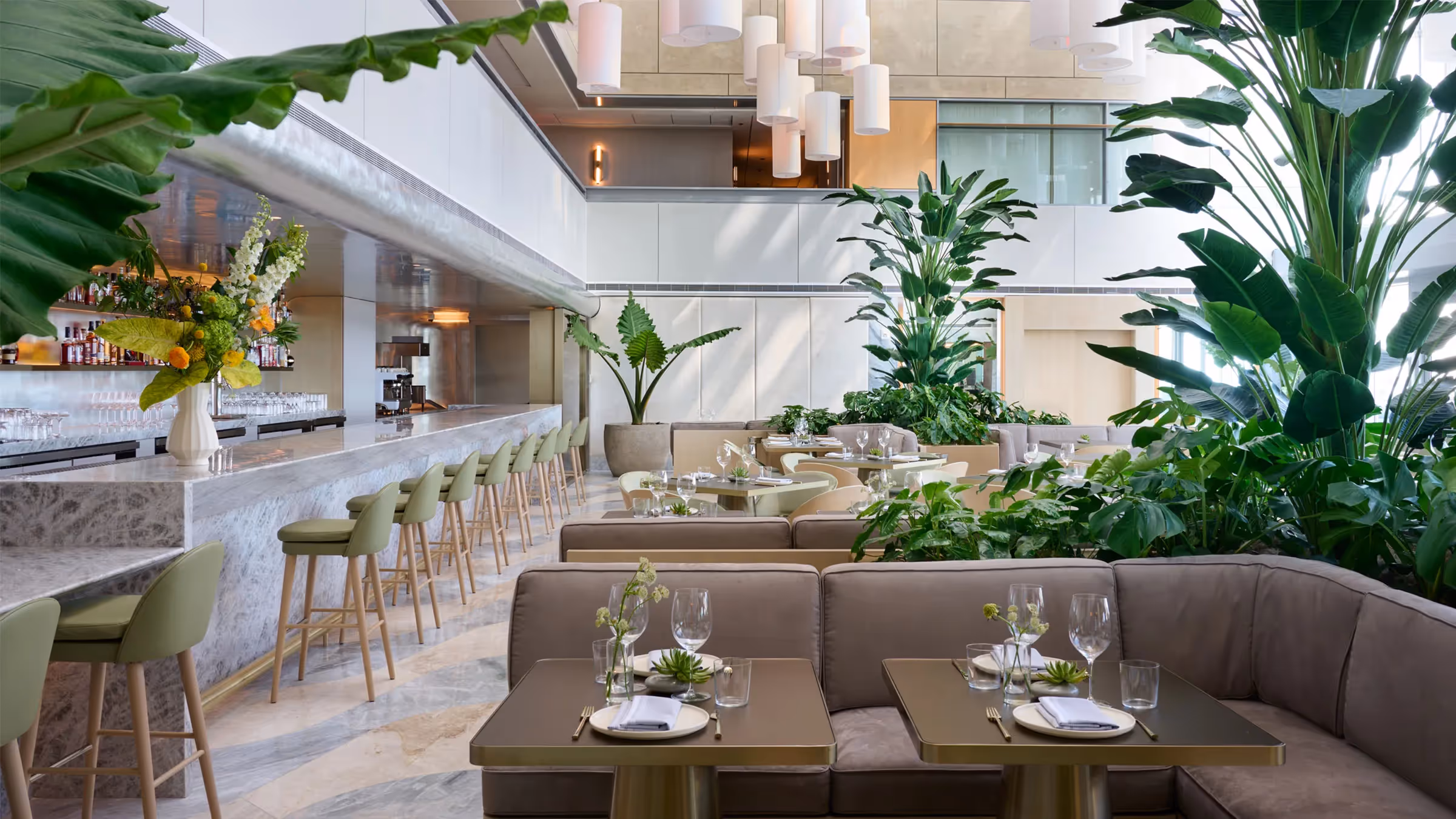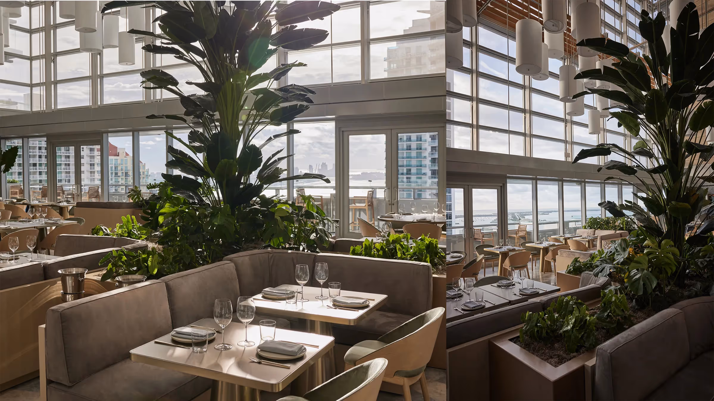 Hotel AKA Brickell’s renovation is reflective of the firm’s focus on creating environments rich with a sense of discovery and spatial harmony through our signature ability to hone light, space, and materials. To achieve this feeling, the team at Gabellini Sheppard carefully considered each and every aspect of the Hotel AKA Brickell’s design and its impact on the guest experience. Organic shapes and natural materials, including warm-toned wood and stone, envelop visitors as soon as they’re welcomed through the building’s front doors. From the materials used to the way light flows within the spaces, all elements of the hotel’s interiors have been designed to evoke peace and tranquility. The restaurant is home to a massive light installation with 100+ custom lanterns situated at varying heights and interspersed in clustered arrangements inside the restaurant. These floating art pieces bring a sense of whimsy and spectacle to the space’s more than 10-story atrium.