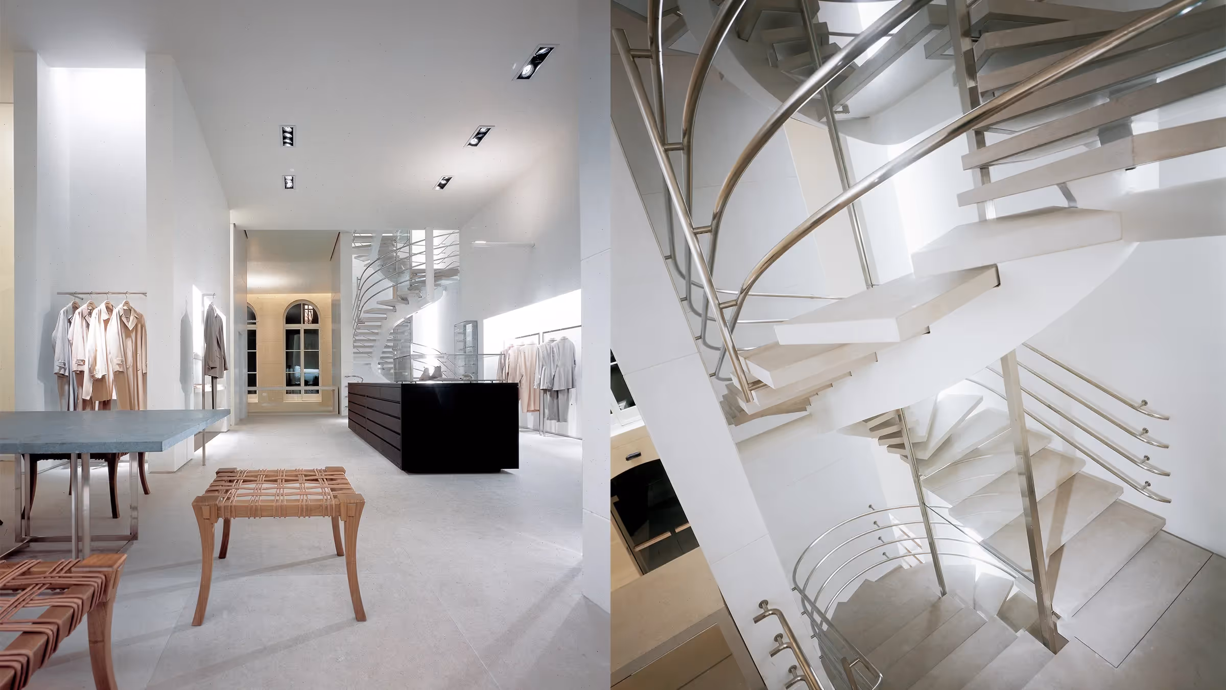 The 12,000 sq. ft. Paris boutique, located at 52 Avenue Montaigne, was constructed in 1890 as a private dwelling for Count de Lariboisiere by architect Tournade as a quintessential example of French Beaux-Arts architecture. The facade received landmark status in 1990, but the interior had already been destroyed. In response to the building’s history, Gabellini Sheppard Associates created a dialogue between its architectural heritage and its current state by creating an open court and revealing the vertical expanse of the front interior bearing wall. The exterior limestone was brought inside to clad the entire interior face in a metamorphic exchange between the old and new. Radically simplified in form and structure, the interior bearing wall took on the appearance of a Roman aqueduct. It was this revelation that inspired the entire design aesthetic—its classical proportions, its interplay between gravity and weightlessness, and its understated use of materials.