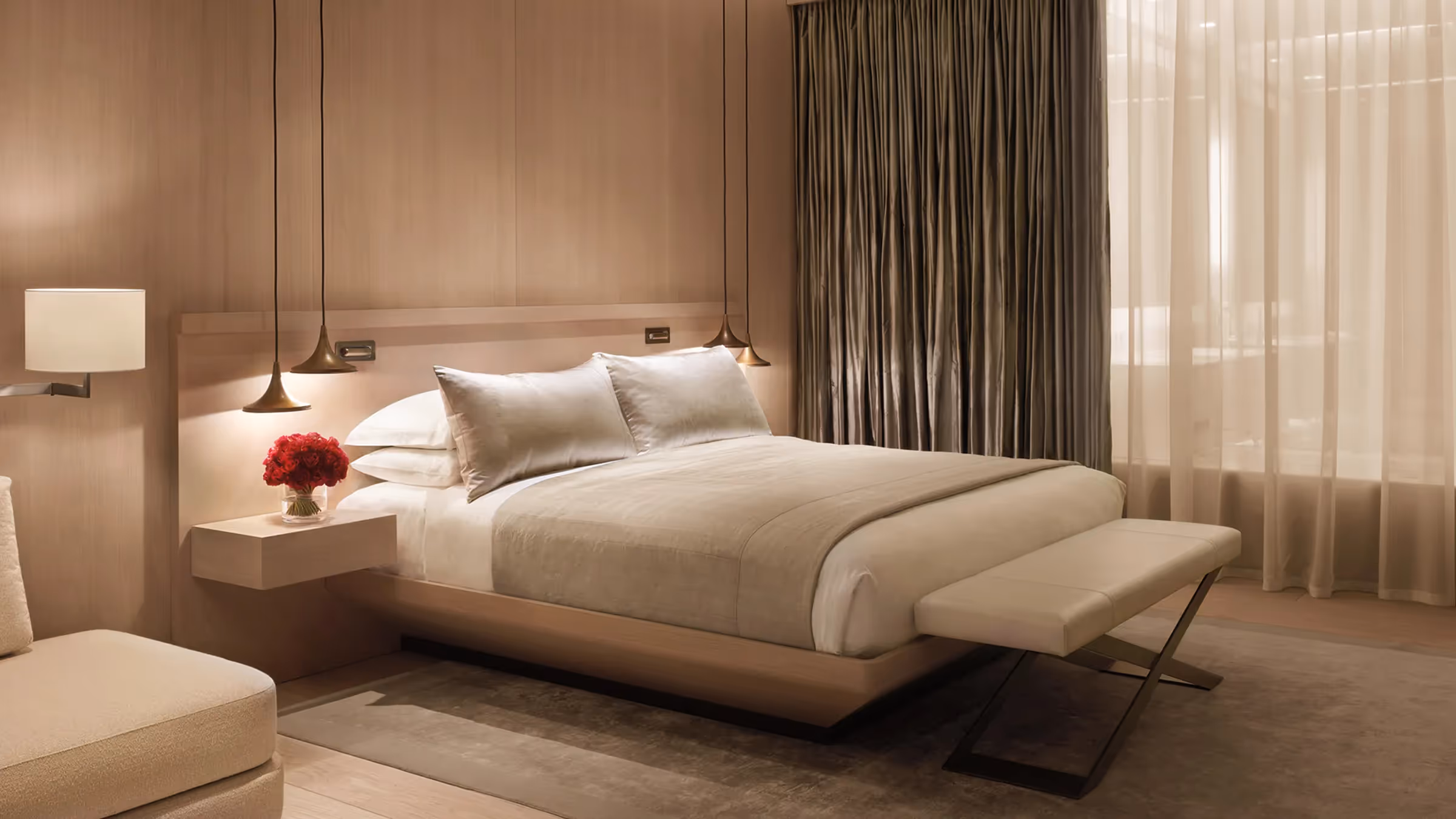 The Platform Bed, developed for use in both residential and hospitality projects, has a beveled platform giving it a modern, hovering appearance while solid in design and construction, as well as maintenance friendly. An extended wooden headboard and cantilevered nightstands can be incorporated with integrated controls and reading lights. This custom-built bed is featured here featured in a light and dark wood option of Soaped Oak and Rosewood.