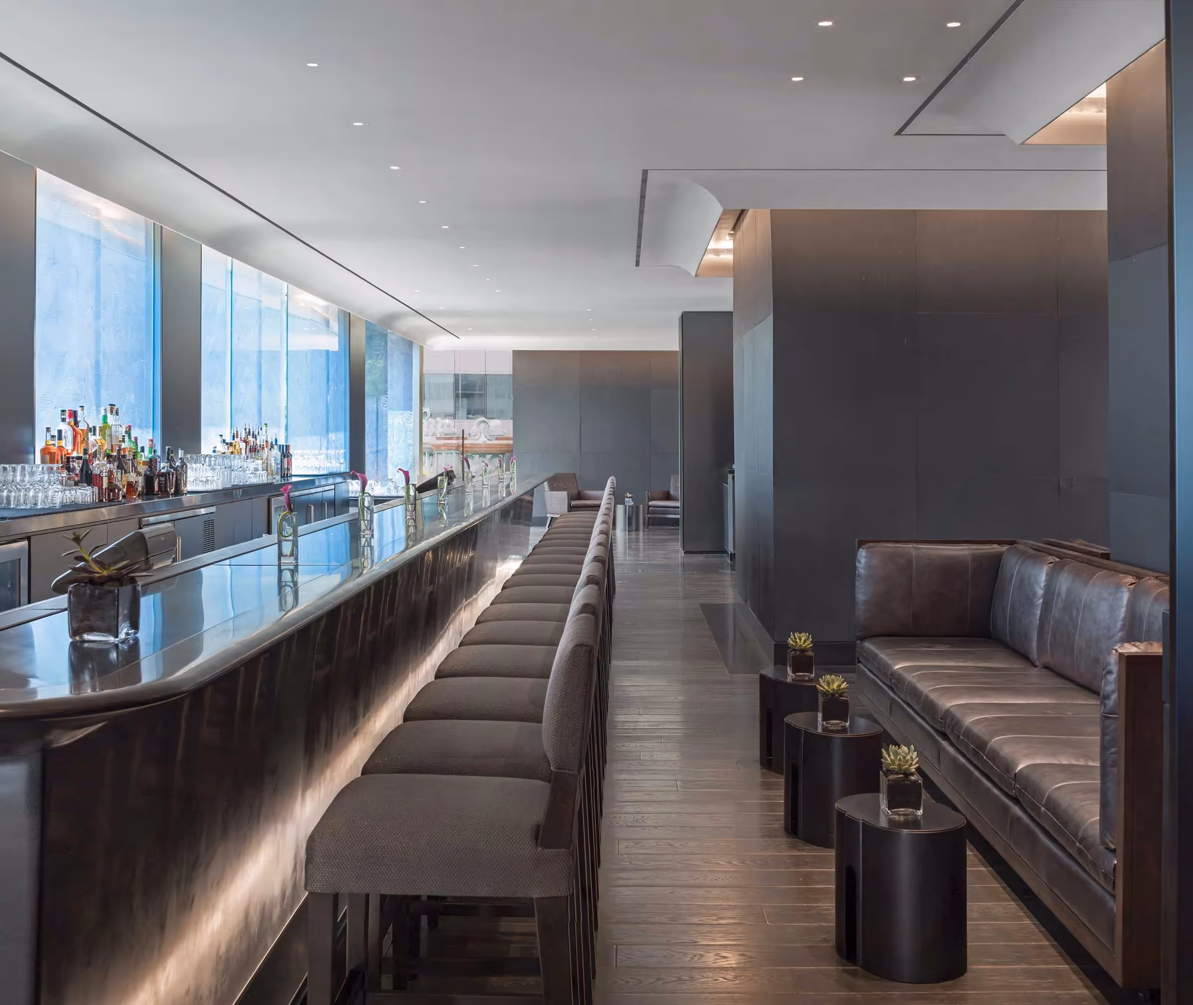 Inside, cool and warm tones interplay, with rich textures, soft fabrics, and metallic tones utilized throughout. Outside, a living wall wraps alongside the interior walls of the outdoor terrace, adding a burst of life and greenery to the rooftops’ Beaux-Arts façade. Skyline and Times Square views are framed across the entire space and the rooftop looks directly at One Times Square and Broadway, making it home to an unbeatable vantage point for the NYE ball drop. In the evening, guests floating above Times Square feel like they’re part of the action down below. The terrace is also home to a sophisticated 25-person seated cigar lounge from Nat Sherman.
