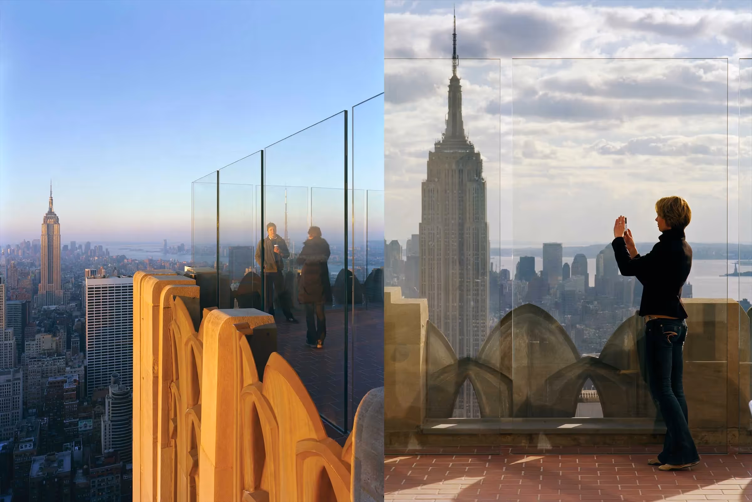 A new, open-air escalator atrium links the 67th Floor interior to the 69th Floor Grand Viewing Terrace encircling the north, west, and south sides of the building. Outside on the restored and renovated observation decks, clear optical glass panels function as subtly as rimless eyeglasses, preserving the building’s original appearance while providing the purest possible viewing experience. The laminated, double-layered glass panels—capable of withstanding hurricane-force winds—allow viewers to appreciate the original architectural details of cast aluminum and limestone. The uncannily serene and intimate, the 850-foot-high high plateau of the 70th floor evokes the upper decks of a 1930s ocean liner floating high above the metropolitan sea.