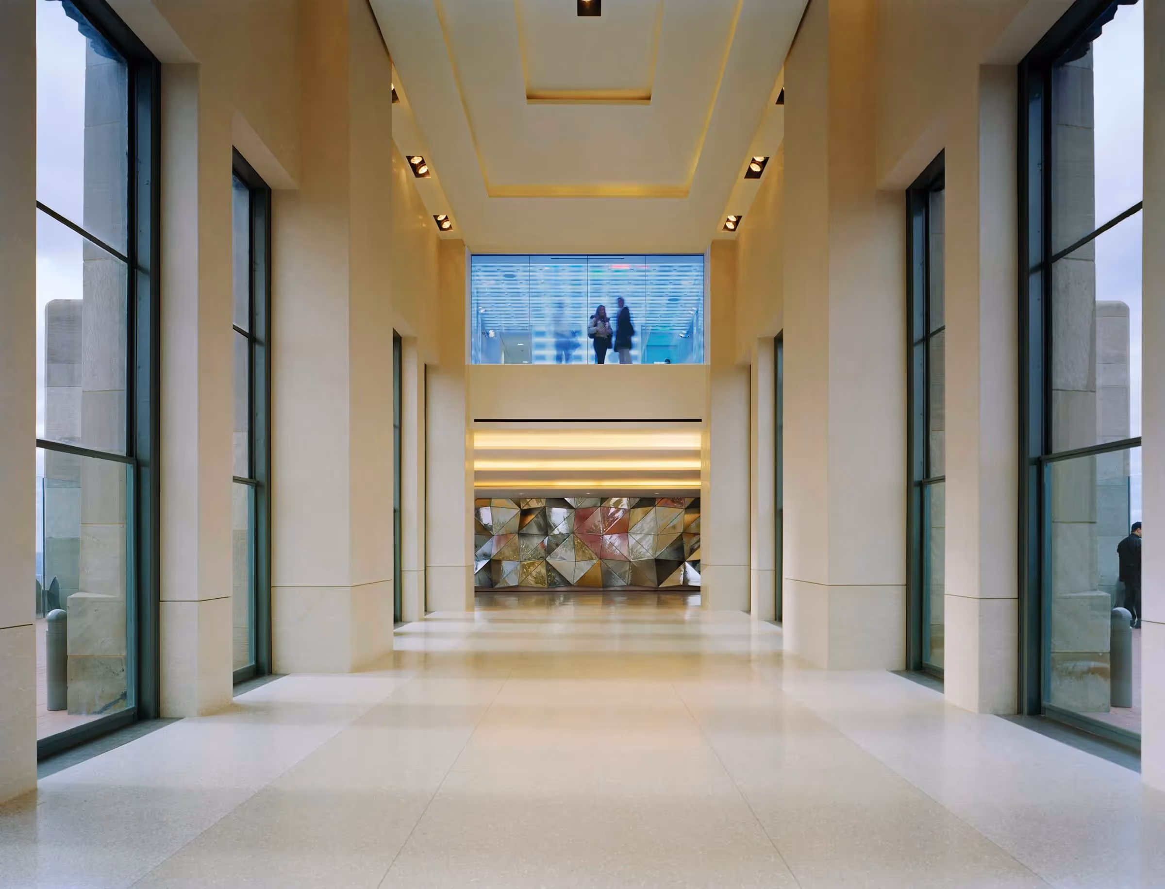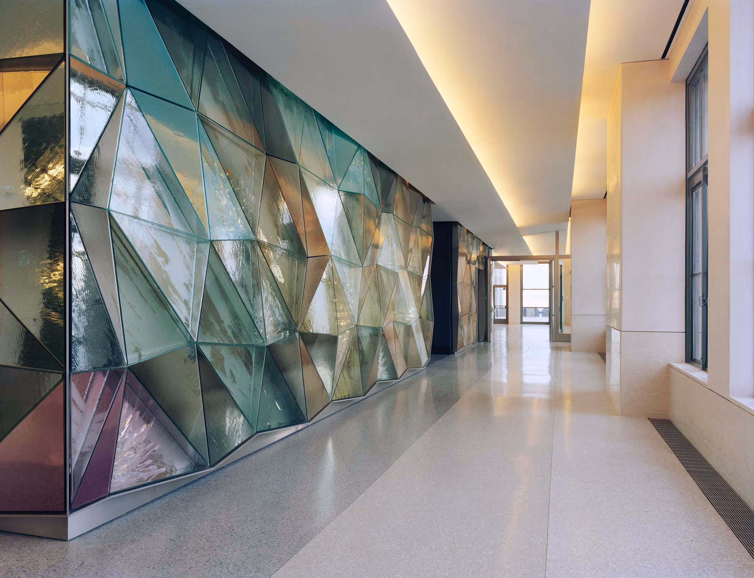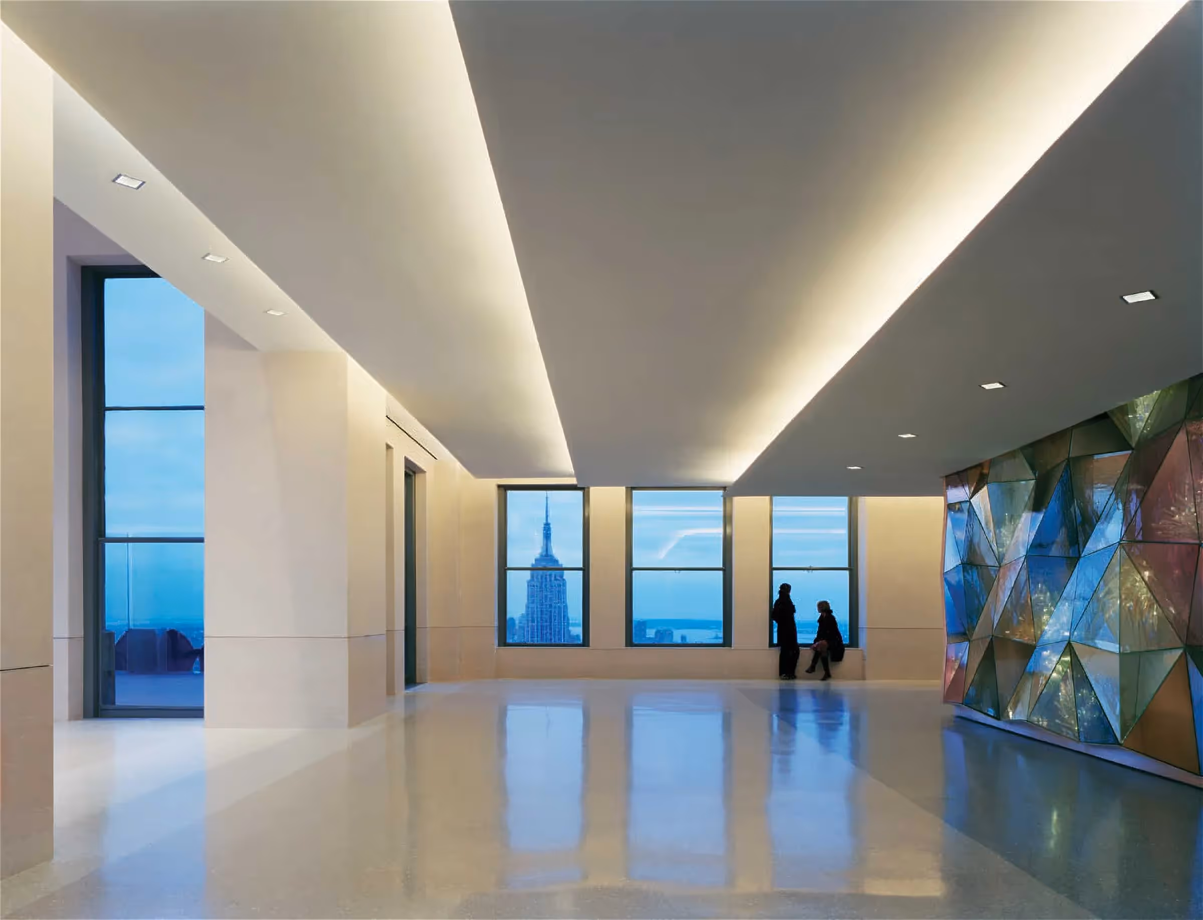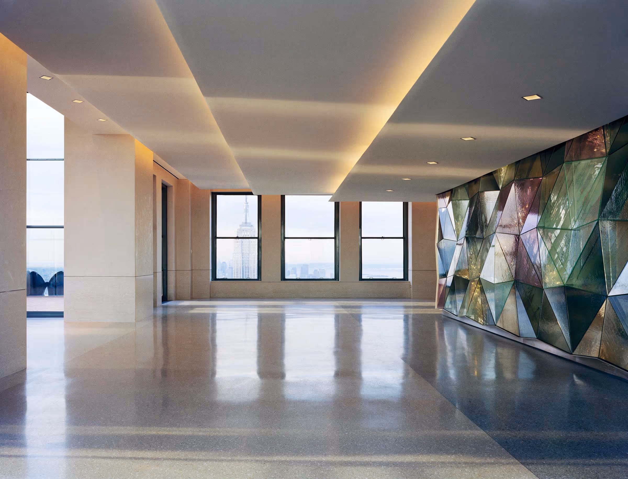 The daylight-infused 67th Floor Grand Viewing Room was reclaimed from utility spaces packed with obsolete mechanical and broadcasting equipment. Surrounding the elevator core, another site-specific art piece designed by the firm—Radiance: Swarovski Crystal Geode Wall—revives the Art Deco era’s flamboyant experimentation with surface geometry and industrial arts. Conceived as an elongated Fresnel lighthouse lens, Radiance pays homage to Rockefeller Center’s renowned artisanal tradition of sculptures, murals, and architecture. Natural light plays upon the 600 prismatic facets while embedded fiber optics glow from within. To produce the wall’s multi-layered, etched surfaces, traditional art glass fabrication techniques were used alongside new technologies for cutting, mapping, and layering glass and crystal. At the eastern end of the 67th Floor lies the Weather Room, a triple-height space proportioned as a chapel. Perimeter walls of limestone and architectural plaster reference the exterior limestone facade. Three colors of honed terrazzo radiate from the center to the perimeter.