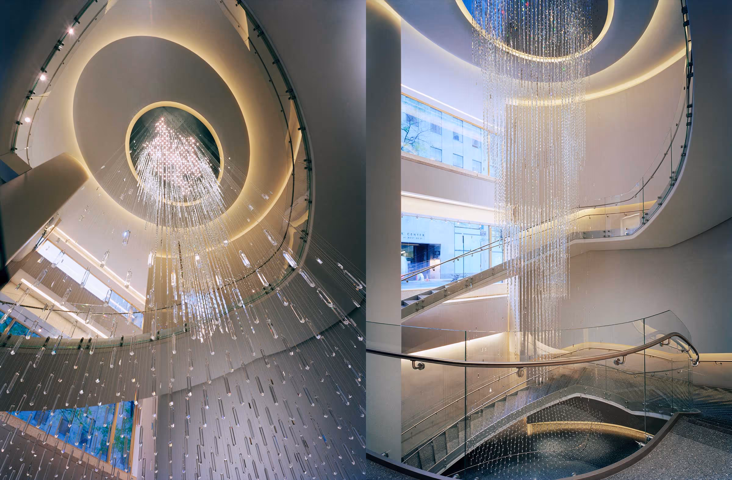The new triple-height ticketing atrium with public street entrance and elliptical stairs was inspired by the expressive grandeur of Rockefeller Center’s original 1930s lobbies. Carved from a non-historic office and retail space, it is punctuated by Joie, a hovering crystal light sculpture designed by Gabellini Sheppard Associates. The chandelier tapers downward as an inverted, diaphanous Art Deco skyscraper. Overlapping, backlit walls of architectural plaster curl around the stair in an upward helical spiral. Subtly gradating in color from black at the base to pale gray at the top landing, terrazzo stair treads add to the sweeping sense of ascension. A gradual lightening of wall paint from bottom to top further heightens this subliminal movement. On the Mezzanine Level, a new exhibition and theater space engages visitors before they board high-speed “sky shuttle” elevators. These glass-ceilinged capsules reveal the original 800-foot elevator shaft, which is dramatically lit with sapphire-blue runway lights.
