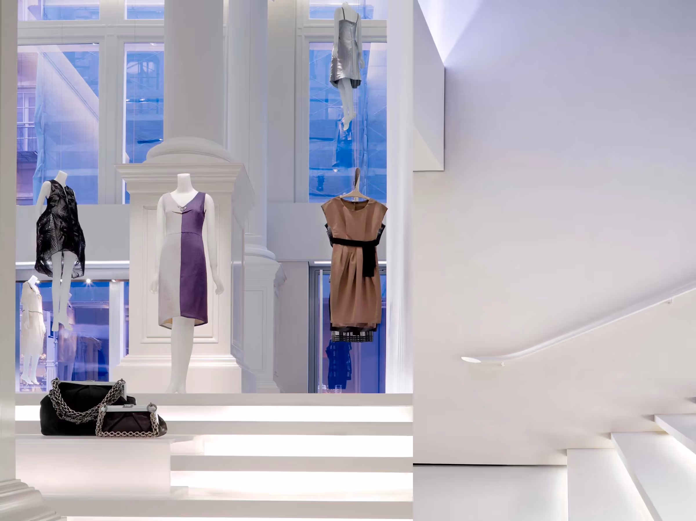 The lighting concept served as the primary spatial element, an LED infused ambient light volume molded and saturated the space with a diffused lavender hue. The design comprised three main areas: the storefront entrance, considered as a proscenium frame, is followed by the center-stage main collection, and finally by the more intimate collection and changing backstage areas. The whimsical, acrobatic display concept exhibited lightness and a graceful interplay of suspended elements.